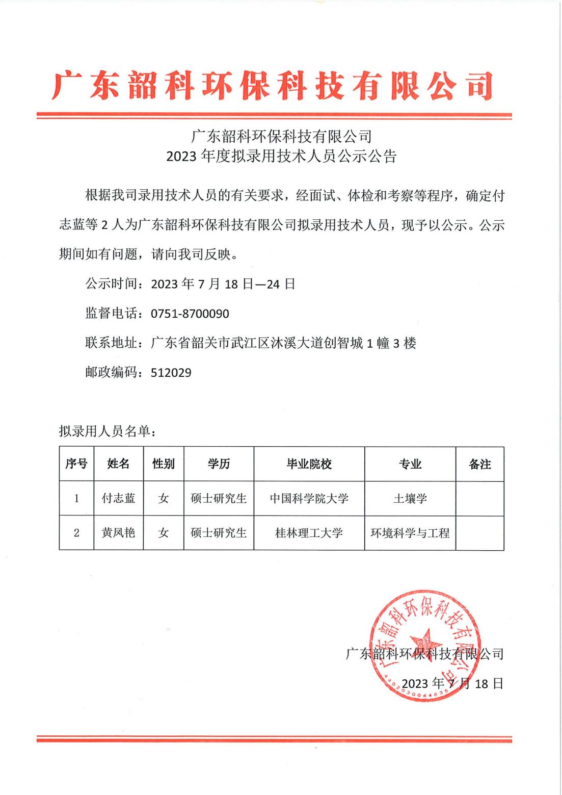 根據(jù)我司錄用技術(shù)人員的有關(guān)要求,經(jīng)面試、體檢和考察等程序,確定付志藍(lán)等2人為廣東韶科環(huán)保科技有限公司擬錄用技術(shù)人員,現(xiàn)予以公示。公示期間如有問題,請(qǐng)向我司反映。